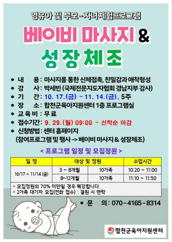 작성자 : 합천군육아지원센터 | 작성일25-09-24 10:29 | 조회110회베이비마사지 & 성장체조 3~8개월