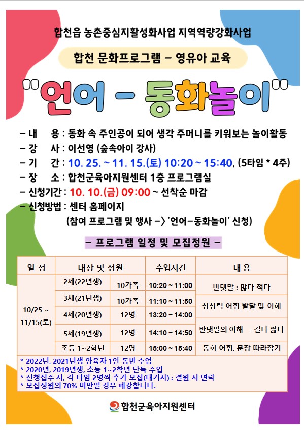 작성자 : 합천군육아지원센터 | 작성일25-10-03 10:44 | 조회74회언어 - 동화놀이 2세(2022년생)