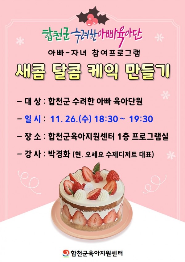 작성자 : 합천군육아지원센터 | 작성일25-11-18 11:19 | 조회105회합천군 수려한 아빠육아단 - 새콤 달콤 케익만들기