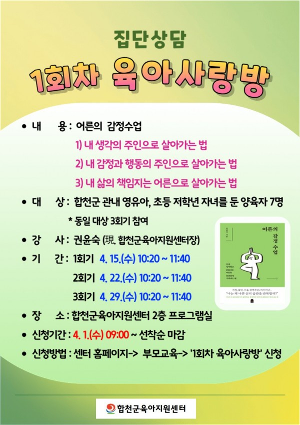 작성자 : 합천군육아지원센터 | 작성일26-03-30 13:54 | 조회15회2026년 1회차 육아사랑방