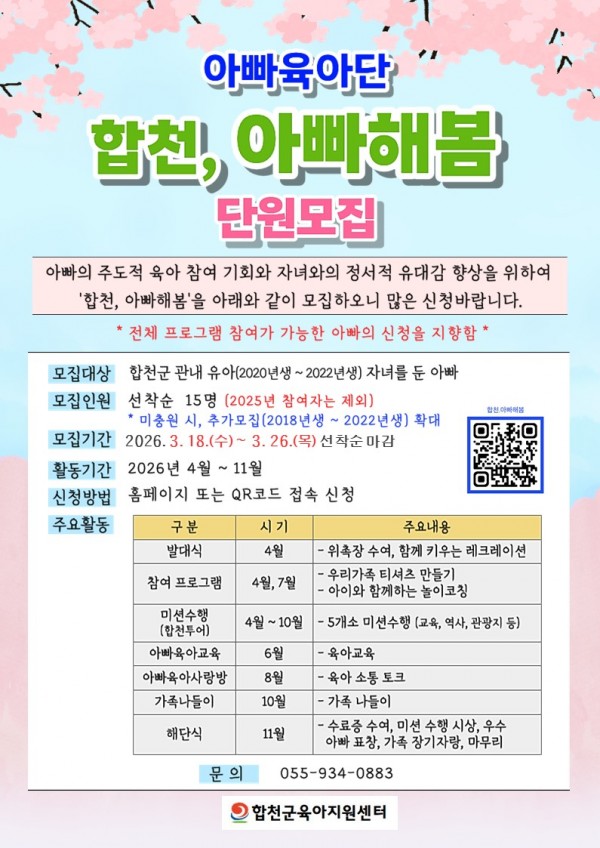 작성자 : 합천군육아지원센터 | 작성일26-03-18 11:37 | 조회138회 | 댓글0건2026년 합천. 아빠해봄(구.아빠육아단)단원모집