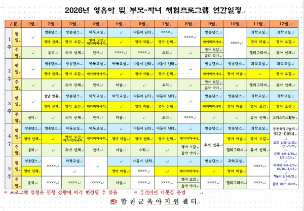 작성자 : 합천군육아지원센터 | 작성일26-01-28 17:18 | 조회45회 | 댓글0건2026년 영유아 및 부모-자녀 체험프로그램 연간일정