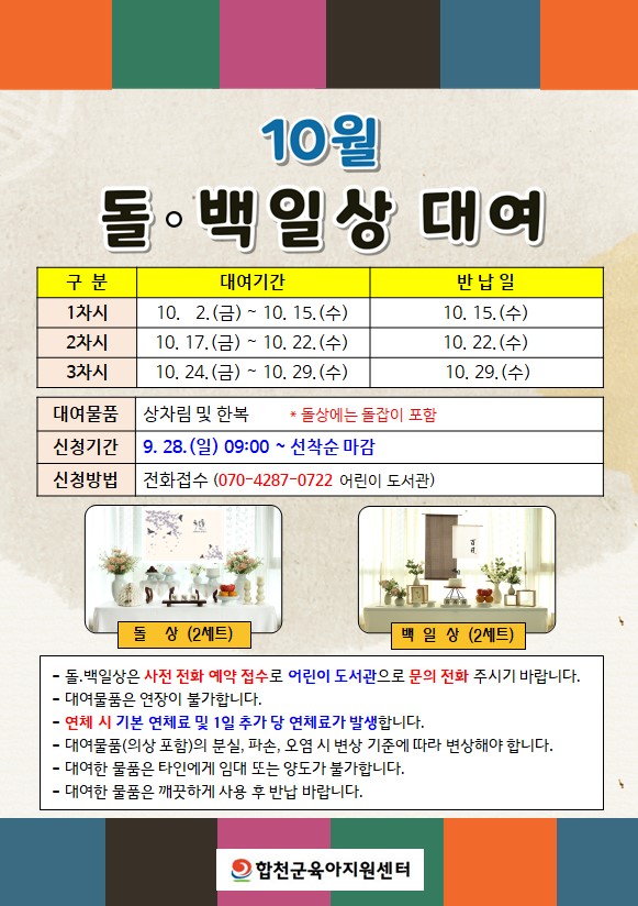 작성자 : 합천군육아지원센터 | 작성일25-09-24 13:48 | 조회94회 | 댓글0건[어린이 도서관]10월 돌.백일상 대여 안내