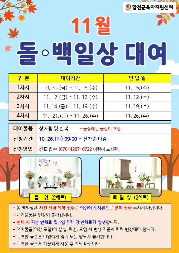작성자 : 합천군육아지원센터 | 작성일25-10-21 17:28 | 조회13회 | 댓글0건[어린이 도서관]11월 돌.백일상 대여 안내