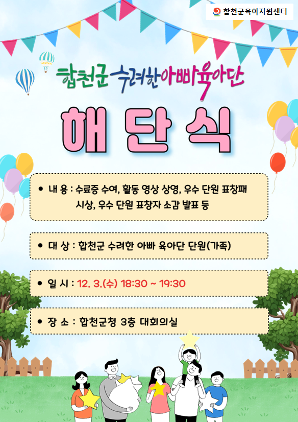 작성자 : 합천군육아지원센터 | 작성일25-11-30 17:41 | 조회65회 | 댓글0건합천군 수려한 아빠 육아단 해단식 안내