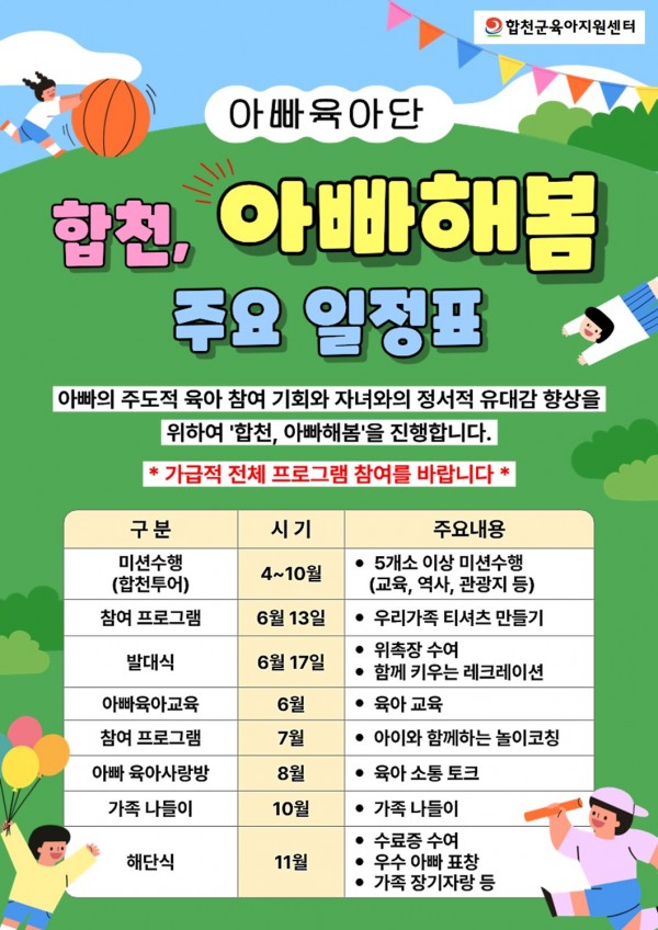 작성자 : 합천군육아지원센터 | 작성일26-04-01 14:36 | 조회28회 | 댓글0건2026년 합천, 아빠해봄 전체 일정표