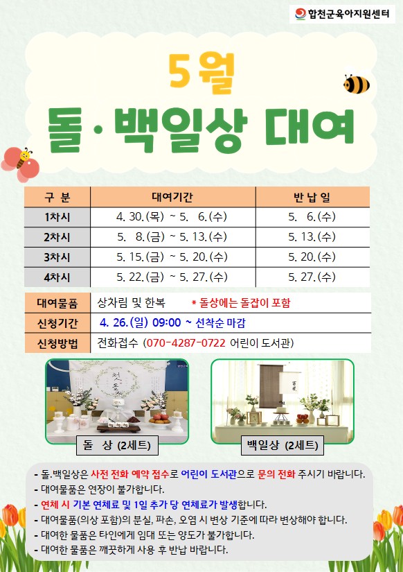 작성자 : 합천군육아지원센터 | 작성일26-04-21 09:54 | 조회10회 | 댓글0건[어린이 도서관]5월 돌.백일상 대여 안내